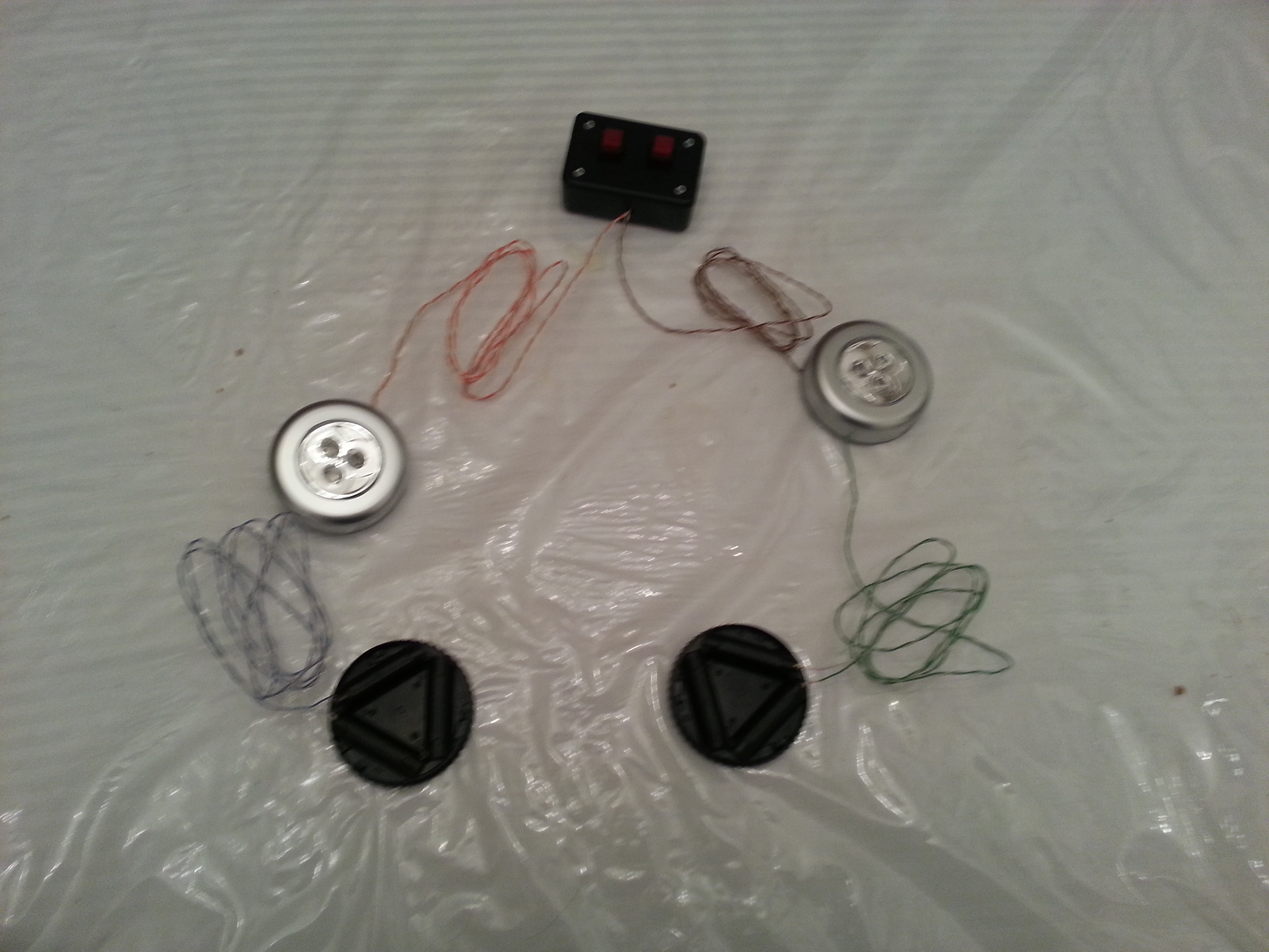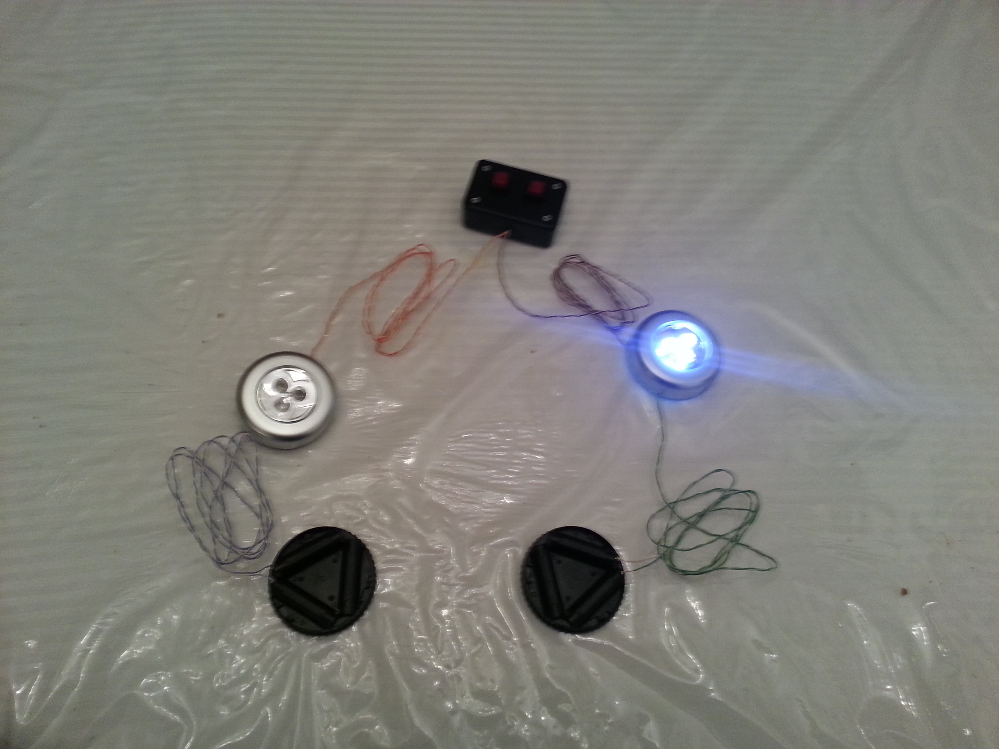 Ok, so as some of you already know, PacKay Productions is building puppets for the Glove Theater’s production of Shrek: The Musical (and my lovely wife will be performing the part of Dragon). Part of Kay’s design for Dragon included eyes that light up, and Kay figured that she could accomplish this by putting a battery-operated LED closet light in each eye:
