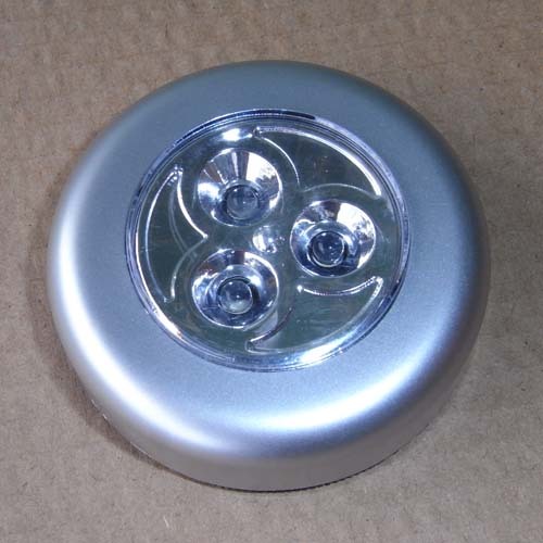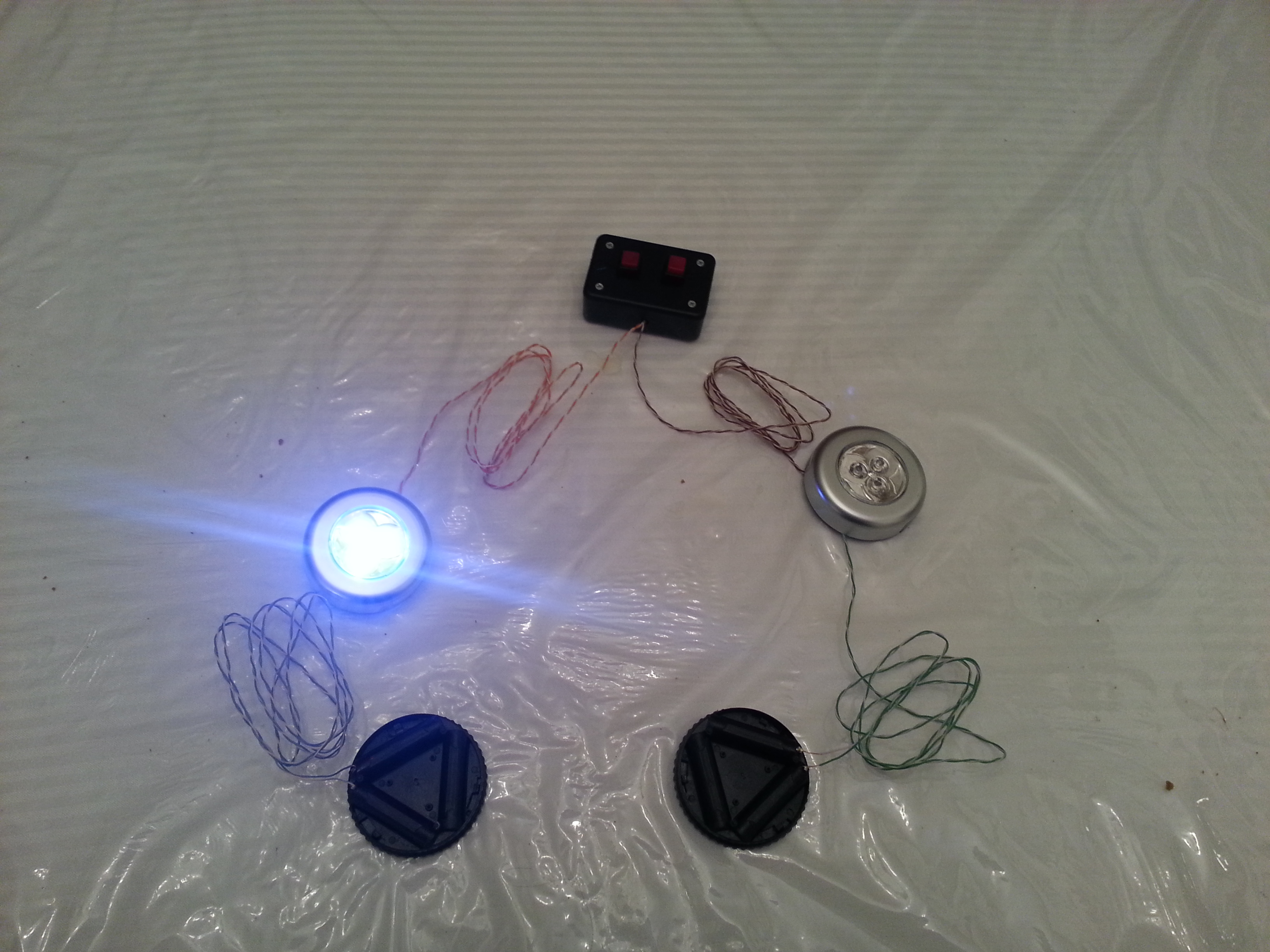 The problem, of course is that to turn those things on, you have to physically press the front on each of them. That’s going to be awkward if you want to light up the eyes while you’re performing with the puppet. “Hey,” I told Kay, “I can move the switch outside the case… heck, I can probably put it at the end of a long wire, so you can have the switches for both eyes next to each other. And I could move the batteries to the end of a long wire, too, so you don’t have to have all that weight up in the eyes.” Kay was skeptical, however, because she didn’t want me ruining the one pair of these lights that she had. So I found another pair for $5 on sale at a hardware store and I took them apart.