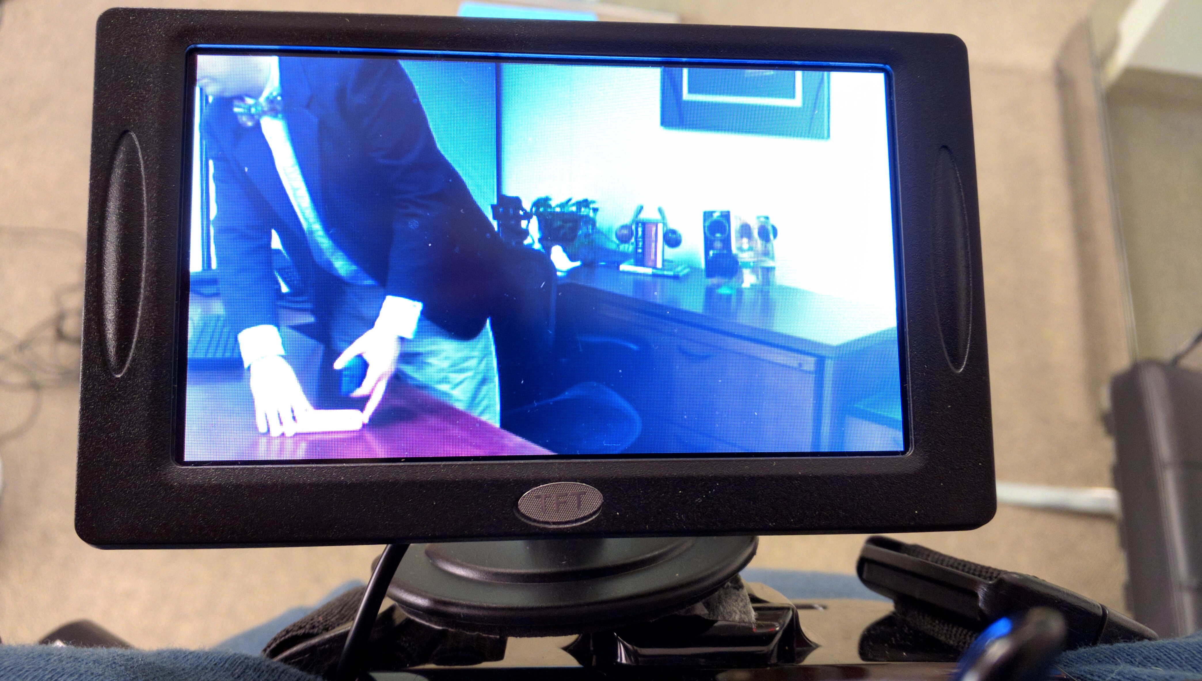 Here’s the video screen attached to my harness while the camera’s filming another one of our characters.